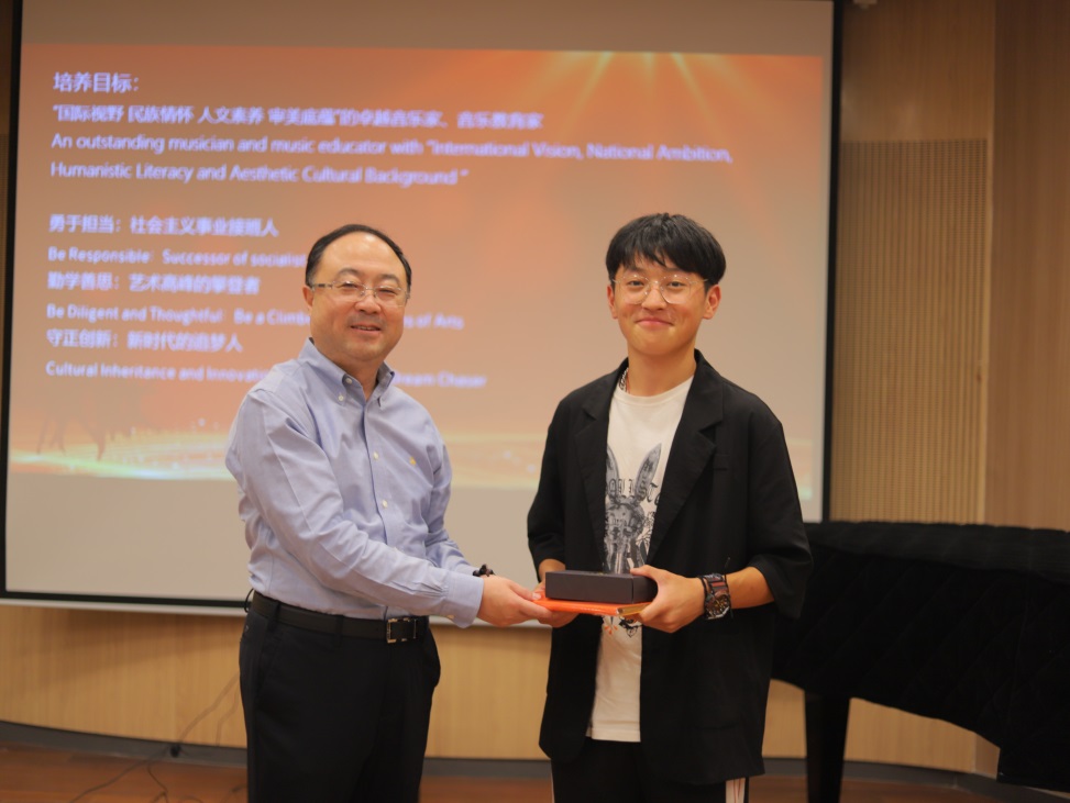 吴院长对新生提出了殷切的希望,希望大家勇于担当,争做社会主义事业的建设者和接班人;勤学善思,成为艺术高峰的攀登者;守正创新,做新时代的追梦人。当天恰逢一位新生生日,学院精心准备了礼物并送上祝福,典礼在温馨的音乐声中结束。
