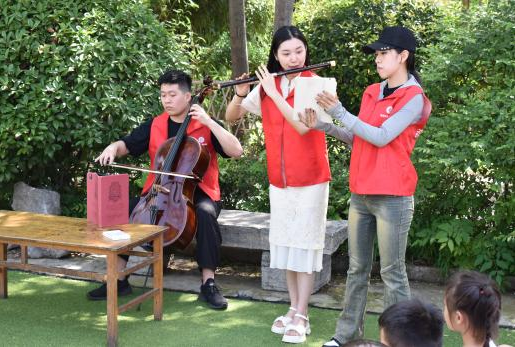 随后,团队成员运用学专业知识进行器乐表演,悠扬的旋律与清脆的声响交织在一起,让孩子们在音乐中感受音乐文化之美。