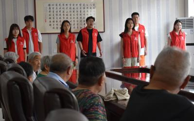 8月2日上午,实践团来到峨山社区村委会,为当地的老年人举办了一场小型音乐会,团队成员表演了竹笛与大提琴合奏《青花瓷》、小号独奏《我和我的祖国》等曲目,以乐声回顾过往艰苦岁月,传递红色精神,老人们与团队成员一同合唱《歌唱祖国》,将现场气氛推向高潮,他们唱出了对祖国的热爱,对幸福生活的赞美。