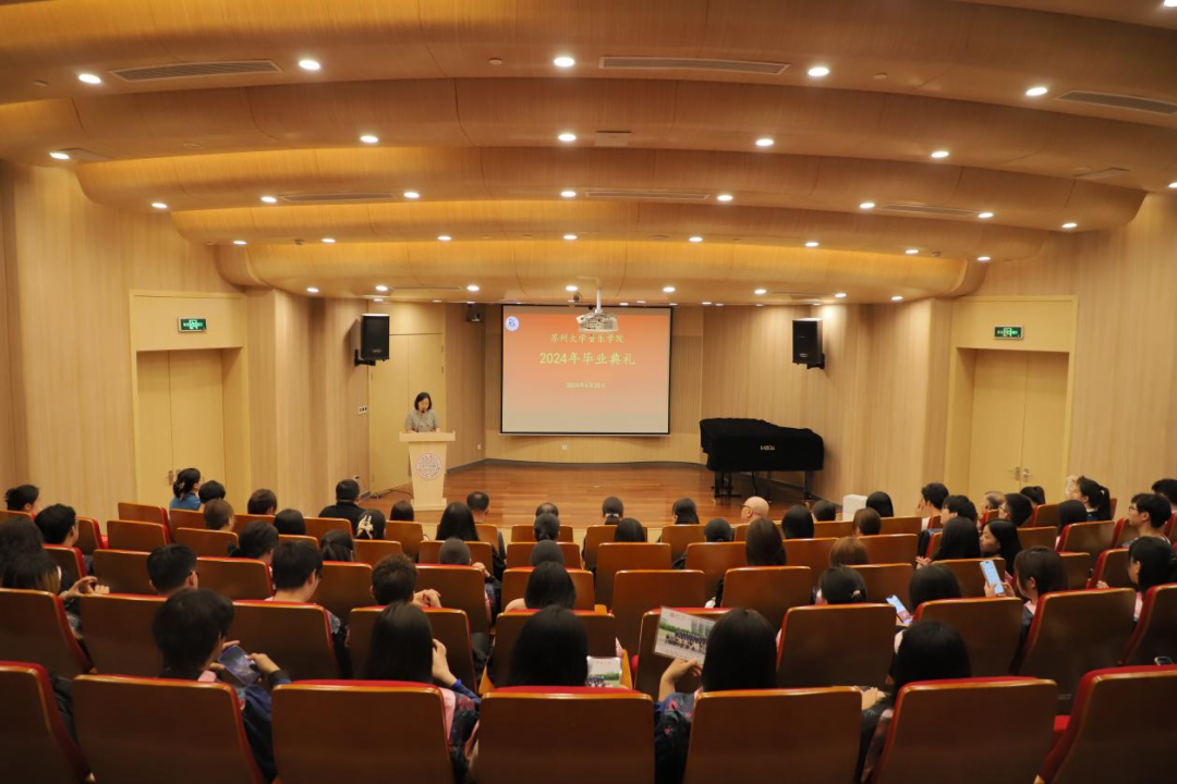 最后,吴磊院长讲话。他首先向同学们的顺利毕业表达祝贺,向学院辛勤工作的教职工致以崇高的敬意,向为同学们成长成才付出努力的后勤人员和家长们表示衷心的感谢。他回顾了毕业生四年来取得的丰硕成果。毕业在即,他向毕业生们提出三点希望:一是要不忘初心,做德艺双馨的艺术家。二是要挺膺担当,做人格健全的从业者。三是带着一片音符向未来,做一个内心丰盈、守候梦想、接受挫折、坚韧前行的平凡人。他希望同学们,继续保持苏大人的人文情怀,以美育浸润的赤子之心看待世间万象,以坚毅不屈的浩然正气伫立浩瀚星河,以乐于奉献的宽阔胸怀成为照亮他人的那束光!