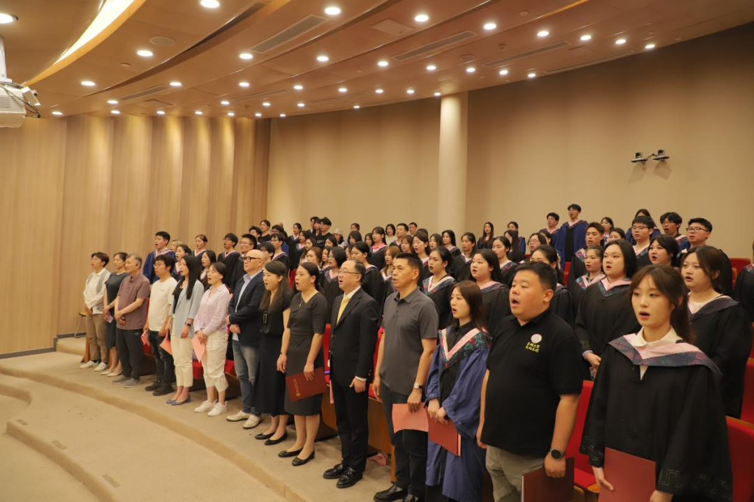 毕业典礼在庄严的国歌声中拉开了帷幕,全体出席人员起立奏唱国歌。
