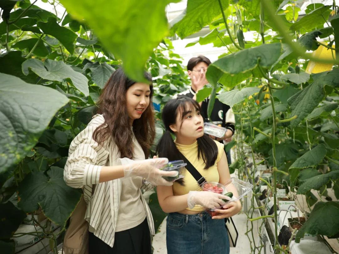夏日采摘乐趣多。随后,师生们纷纷跃跃欲试,在工作人员的指引下,大家在垄垄翠绿的植株间采摘小番茄、黄瓜等新鲜瓜果,在劳动实践中感受自然的田园野趣,同时也更加深入地感受到劳动的艰辛与丰收的喜悦。