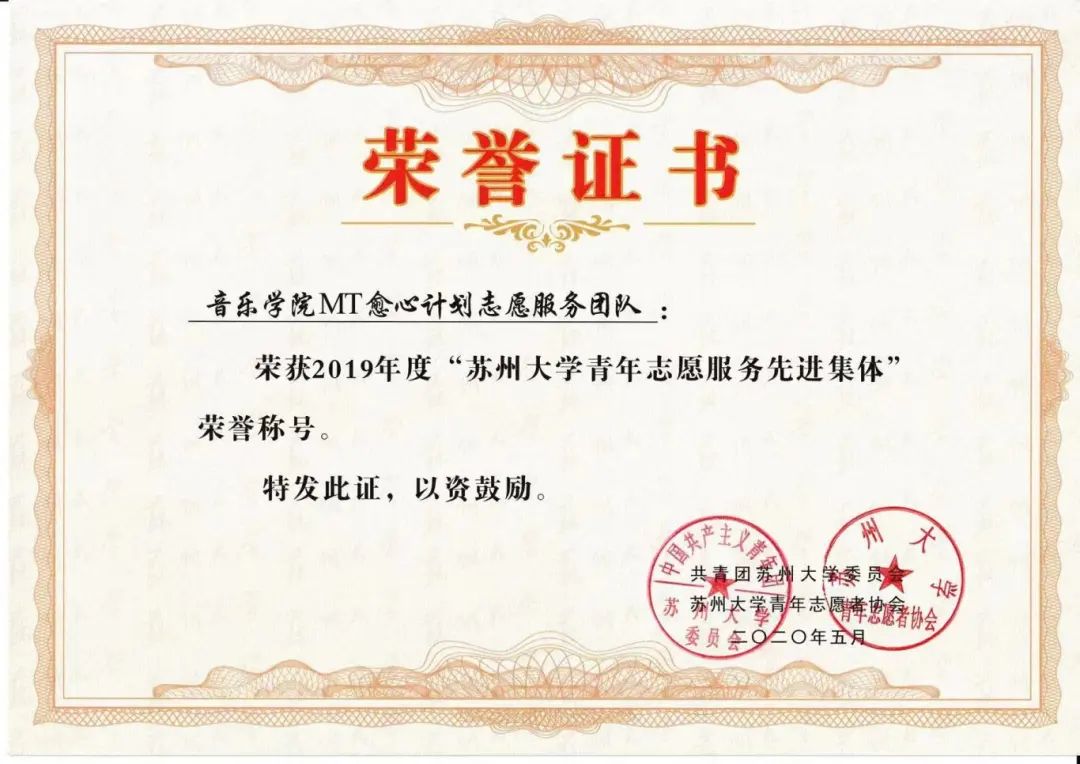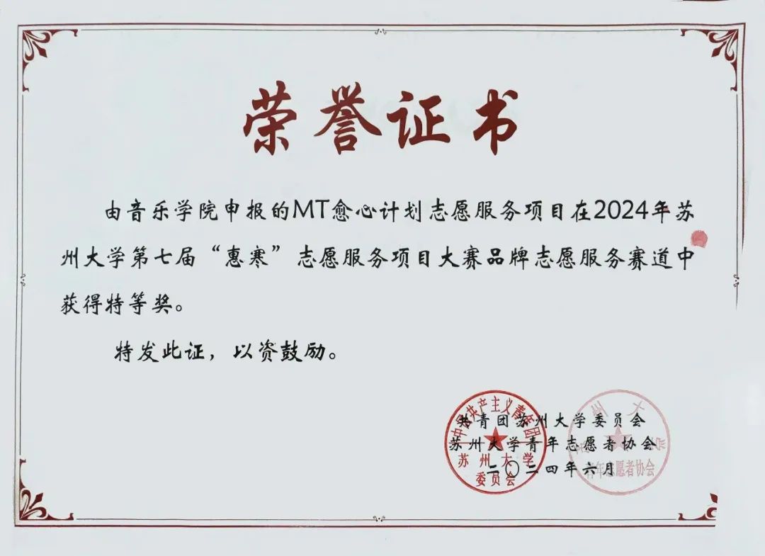 “MT愈心计划”志愿服务团曾获“成人a片 志愿服务先进集体”,“2024年成人a片 王晓军精神文明奖先进集体”,“成人a片 第七届‘惠寒’志愿服务项目大赛特等奖”等奖项,2024年3月苏州电视台对“MT愈心计划”志愿服务活动进行了专题报道。