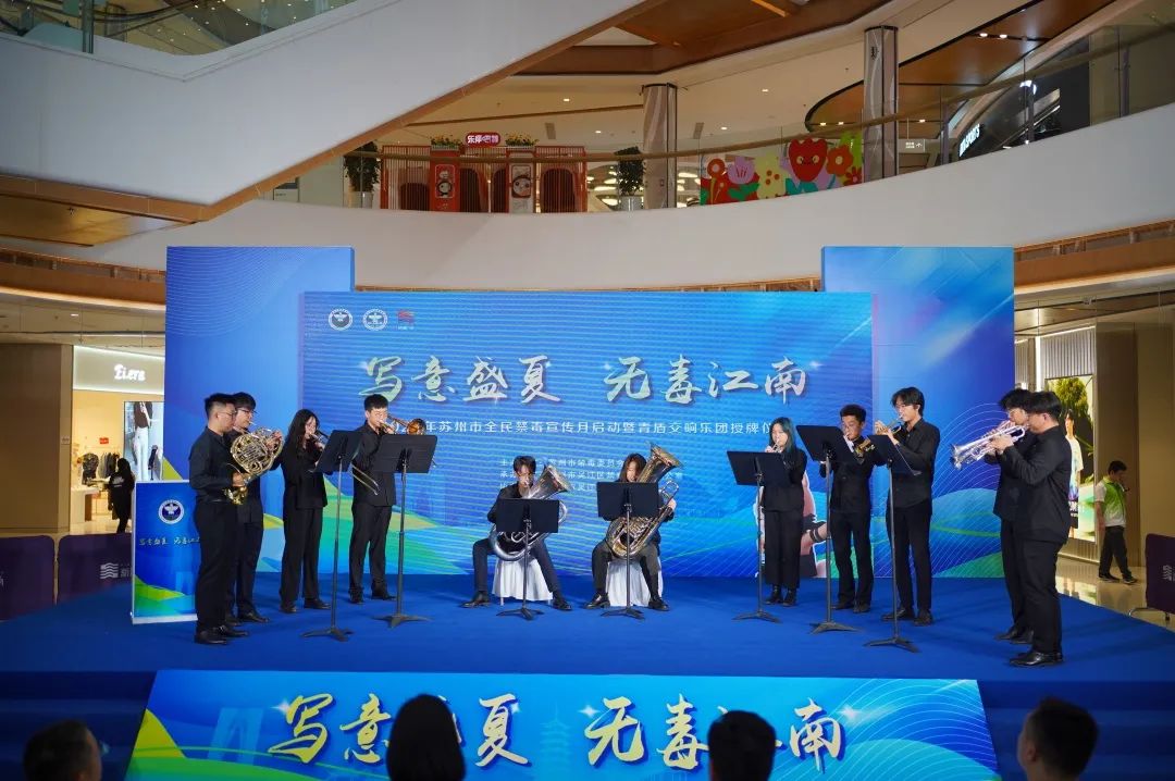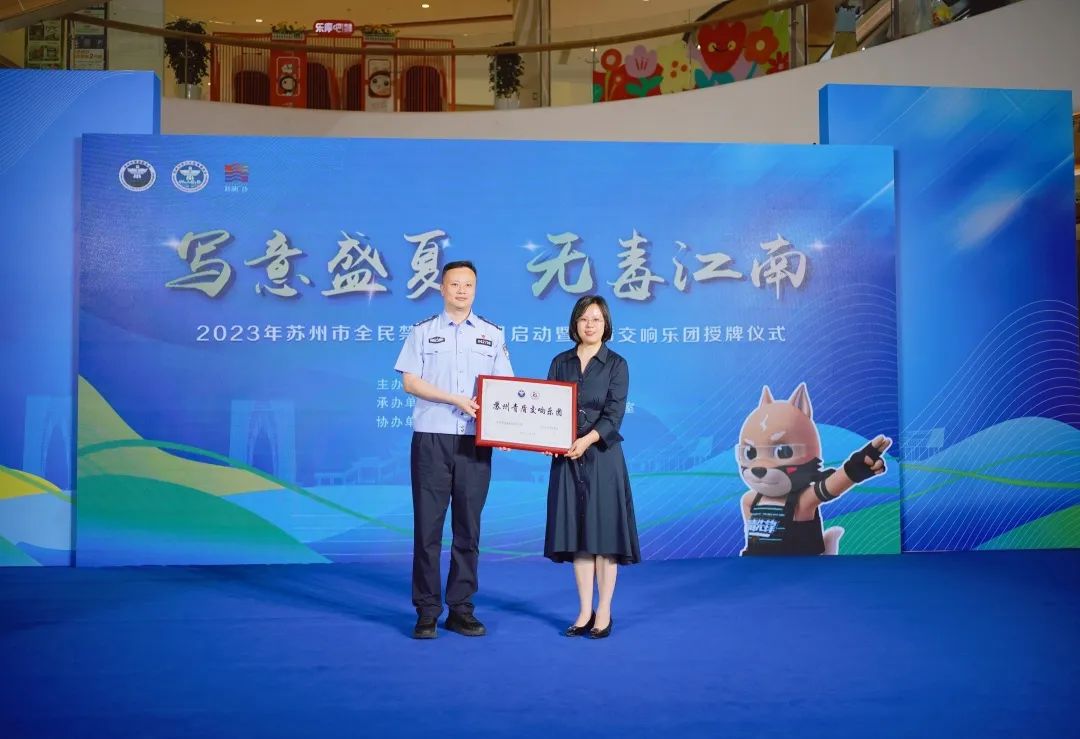 6月1日,“写意江南 无毒盛夏”——2023年苏州市全民禁毒宣传月启动暨青盾交响乐团授牌仪式在吴江区新湖广场隆重举行。苏州市禁毒委副主任兼禁毒办主任、市公安局党委委员、副局长吴建伟,成人a片 党委副书记、副院长杨燕,苏州市禁毒办副主任、市公安局禁毒支队支队长赵冰,吴江区政法委员会副书记、区社会矛盾纠纷调处化解中心主任、区禁毒委副主任沈正华等人出席此次活动。
