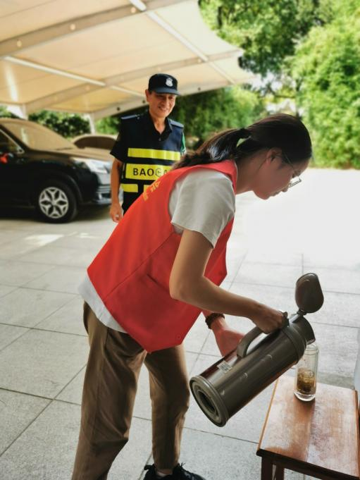 图为杨颖洁同学在补给站为保安叔叔续水