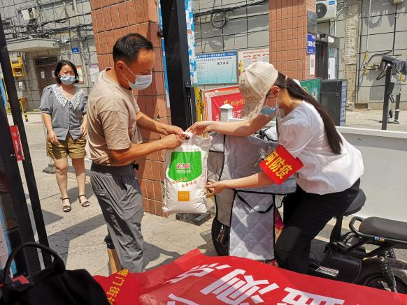 图为朱珪秀同学为社区居民运送粮食