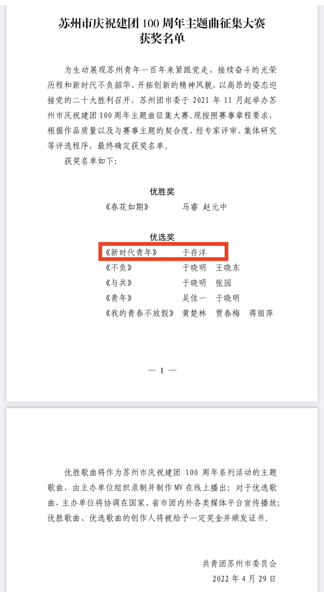 成人a片 团委书记于存洋原创歌曲《新时代青年》通过欢快的旋律唱出了百年来,一代又一代中国青年紧跟党走、接续奋斗,在青春赛道上奋力奔跑,用汗水谱写一曲又一曲青春之歌的勇敢与担当,展现了新时代青年开拓创新、勇于追梦、昂扬向上的精神风貌。歌曲获苏州市庆祝建团100周年主题曲征集大赛“优选奖”。