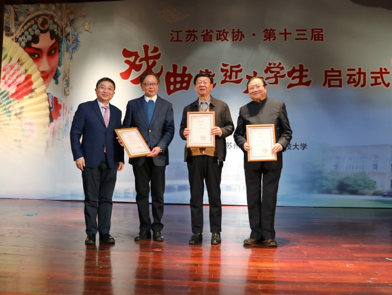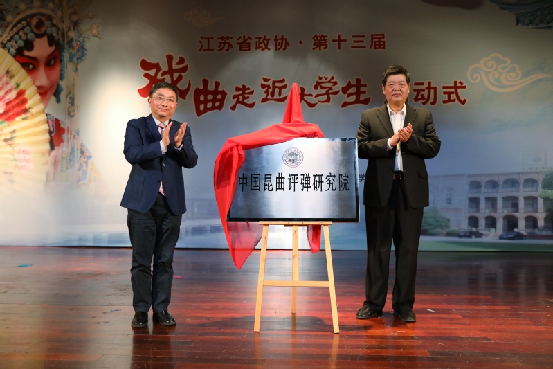 3月13日晚,在独墅湖校区举办的江苏省政协·第十三届“戏曲走近大学生”启动式上,江苏省政协副主席周继业和成人a片 党委书记江涌为成人a片 中国昆曲评弹研究院揭牌,同时江涌为研究院顾问顾浩、陆军、执行院长朱栋霖颁发聘书。
